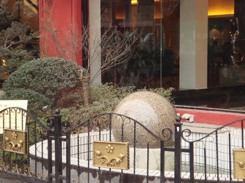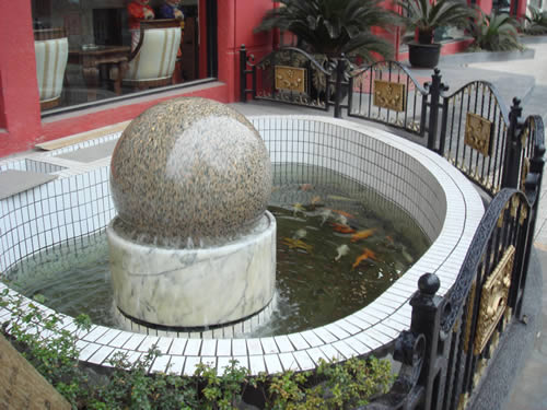 此球系花崗石制成 : 精雕細磨,光潔如鏡面;圓度接近真圓;直徑80厘米;重量1000KG。球體與底座完全吻合,滴水不漏。利用水泵輸送水而產(chǎn)生的滲透力和張力使其漂浮在水面,可以根據(jù)所需任意方向連續(xù)滾動。(俗稱:風(fēng)水球,寓意:財源滾滾。)