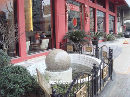 A.I.A臻品國際設(shè)計集團”,公司從2000年成立至今,門口始終有一輪“風(fēng)水球”,7年來無論公司怎樣不斷擴大店面,不斷在擴修場地,甚至不惜血本將其平移十幾米遠,但這輪風(fēng)水球始終如一的旋轉(zhuǎn)不停,引來不少的人群駐足圍觀。清澈的活水與歡悅的魚兒相映成趣,好一幅上海徐家匯鬧市中的恬淡畫卷!